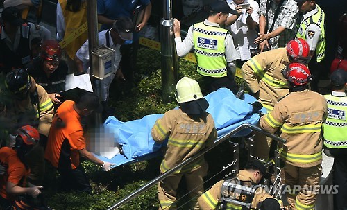 | △ 병원으로 이송되는 수요집회 분신시도 남성 (서울=연합뉴스) 이지은 기자 = 12일 오후 서울 종로구 주한 일본대사관 앞에서 열린 수요집회에서 분신을 시도한 한 남성이 병원으로 이송되고 있다. |
