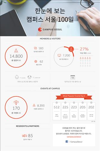 구글에 따르면 개관 이래 100일간 62개국 7천200여명이 캠퍼스 서울에 회원으로 등록했다. 이 가운데 여성 회원은 1천920명으로 여성 창업가들의 활발한 참여가 돋보였다.
