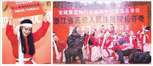 무대 벽에는 '쑹청그룹 CEO가 중기위에 실명으로 저장성 고급인민법원장 치지를 고소한다'는 글이 적혀 있었다.