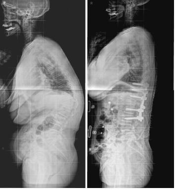 | △ 척추후만증 수술전(왼쪽)과 새 절골술로 수술한 후의 엑스레이 사진. <강동경희대병원 제공> |
