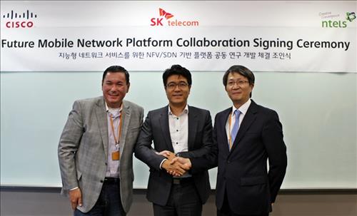 박진효 SK텔레콤 네트워크 기술원장과 스콧 야우 시스코 모바일가상화솔루션제품 총괄 부사장, 심재희 엔텔스 대표는 12일 서울 을지로에 있는 SK텔레콤에서 열린 체결식에 참석해 지능형 네트워크 플랫폼 개발에서 적극 협력할 것을 다짐했다.