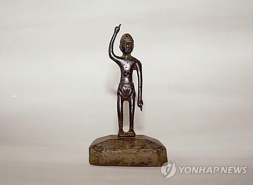 | △ (AP/쓰시마시 교육위원회=연합뉴스.자료사진) 작년 11월 일본 나가사키(長崎)현 쓰시마(對馬)시 미쓰시마 초(美津島町) 소재 바이린지(梅林寺)에서 한국인 절도범들이 훔친 높이 11cm의 구리 불상 '탄생불.9세기 신라시대의 것으로 추정된다. |