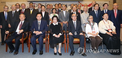 | △ 2015 동아시아평화국제회의 (서울=연합뉴스) 한종찬 기자 = 13일 오전 서울 대한상공회의소에서 열린 '2015 동아시아평화국제회의'에서 참석자들이 기념촬영을 하고 있다. |