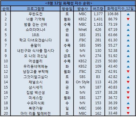 다음소프트가 트위터 버즈량을 기반으로 분석한 12일 TV 프로그램 화제성 지수에서도 '무한도전'은 106.86으로 전체 프로그램 중 1위를 차지했다.