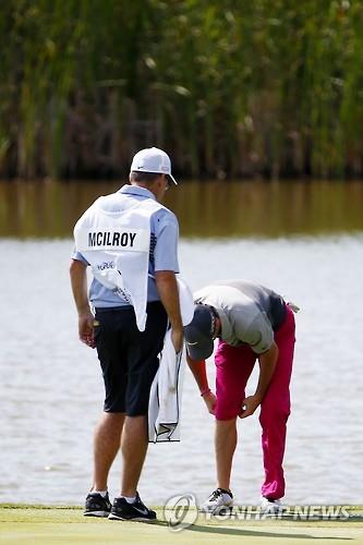 | △ 로리 매킬로이가 5번홀 워터 해저드에서 어프로치 샷을 하기 위해 바지를 걷어올리고 있다. (AFP=연합뉴스) |