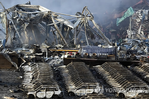 | △ 엿가락처럼 휘어진 톈진항 철골 (톈진 AP=연합뉴스) 13일(현지시각) 폭발사고가 일어난 중국 동북부 톈진항. 창고 철골이 마치 엿가락처럼 휘어지고 주차장에 세워놓았던 새 차들이 순식간에 타버렸다. |