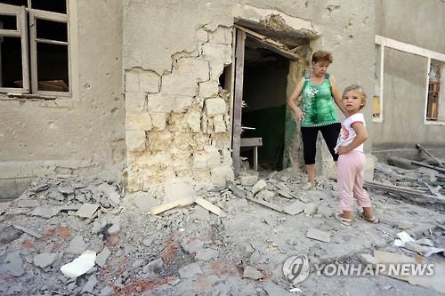 | △ 지난 10일(현지시간) 우크라이나 정부군과 반군의 교전에 폭격 당한 집 앞에 여성과 소녀가 서 있다. (AFP=연합뉴스) |