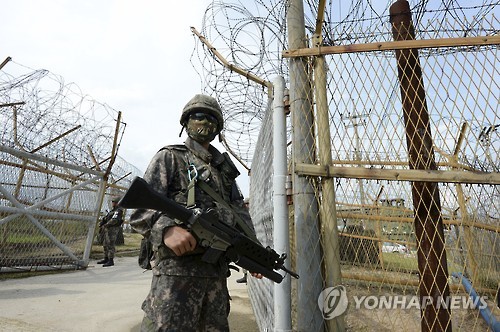 | △ In this Aug. 9, 2015, photo provided by the Defense Ministry, a South Korean army soldier stands guard near the scene of a blast inside the demilitarized zone in Paju, South Korea. Vowing to hit back, South Korea said Monday, Aug. 10, 2015, that North Korean soldiers laid the three mines that exploded last week at the border and maimed two South Korean soldiers. (The Defense Ministry via AP) |