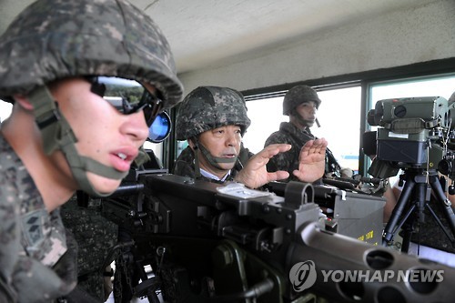 | △ 한민구 국방장관, 비무장지대 소초 현장 순시 (서울=연합뉴스) 한민구 국방부 장관이 10일 북한군이 매설한 목함지뢰 폭발 사고가 발생한 비무장지대(DMZ) 소초(GP)를 방문해 순시하고 있다. 한 장관은 이날 "적의 도발에 응당하는 혹독한 대가를 치르게 할 것"이라며 "적이 도발해오면 GP장 판단 하에 주저함 없이 자신감을 갖고 과감하고 단호하게 대응해달라"고 지시했다. 2015.8.10 << 국방부 제공 >> photo@yna.co.kr |