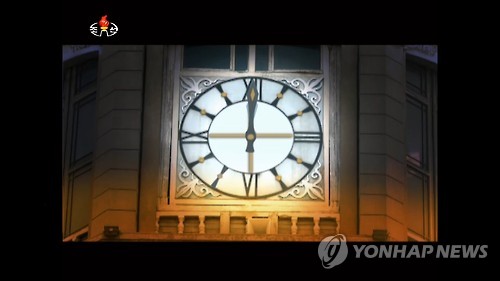 | △ 북한, 오늘 0시부터 '평양시' 사용 (서울=연합뉴스) 북한은 15일 0시를 기해 기존 표준시인 동경시보다 30분 늦은 평양시를 사용한다. 조선중앙TV는 15일 0시(동경시로 15일 0시30분)에 0시를 알리는 시계 모습을 내보냈다. 2015.8.15 nkphoto@yna.co.kr |