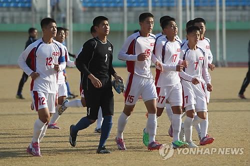 | △ 지난해 경기도 연천 공설운동장에서 열린 2014 국제유소년(U-15) 축구대회 결승전 북한과 우즈베키스탄의 경기에서 승리한 북한 선수들이 경기를 마치고 돌아오고 있다. (연합뉴스 자료사진) |