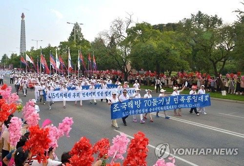 | △ 북한 '조선의 평화와 통일을 위한 연환모임' 개최 (평양 조선중앙통신=연합뉴스) 지난 14일 북한 평양에서 광복 70주년을 맞아 '조선의 평화와 통일을 위한 연환모임'이 열리고 있다. 이날 참석자들은 평양 주체사상탑 앞에서 조국해방 70돌기념 민족통일대회기와 공화국기, 통일기를 들고 출발해 행사장인 청년중앙회관으로 행진했다. 2015.8.15 photo@yna.co.kr |