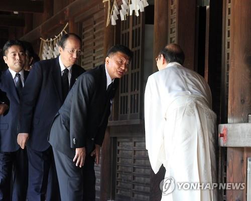 | △ 야스쿠니신사 참배한 신도 전 총무상 (도쿄=연합뉴스) 이세원 특파원 = 신도 요시타카(新藤義孝, 오른쪽 두 번째) 일본 중의원(전 총무상)이 15일 오전 '다함께 야스쿠니신사를 참배하는 국회의원 모임'(이하 모임)에 소속으로 야스쿠니신사 참배를 마친 후 신사 관계자에게 허리를 굽혀 인사하고 있다. 모임 측은 이날 의원 66명인 단체로 참배했다고 밝혔다. 2015.8.15 sewonlee@yna.co.kr (끝) |