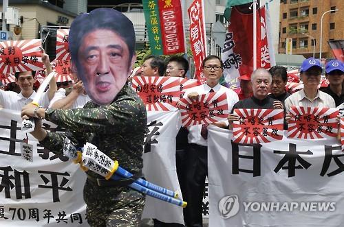 이날 양안평화포럼, 대만노동당, 중화통일촉진당 등 단체의 회원 100여명은 피켓과 플래카드를 들고 "1930∼1940년대 중국 침략에 대해 일본은 진심으로 사죄해야 한다"고 주장했다.