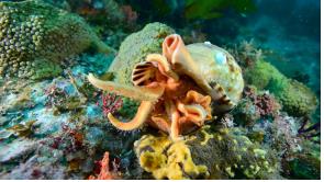 (서울=연합뉴스) 임주영 기자 = 국립공원관리공단은 한려해상국립공원 내 홍도에서 멸종위기종 야생생물 1급인 '나팔고둥'이 불가사리를 잡아먹는 모습을 국내 최초로 촬영했다고 16일 밝혔다.