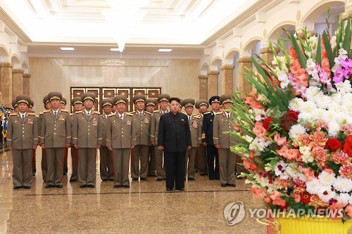 | △ 북 김정은, 해방 70돌 맞아 금수산태양궁전 참배 (평양 조선중앙통신=연합뉴스) 김정은 북한 국방위원회 제1위원장이 해방 70돌인 15일 0시 금수산태양궁전을 찾아 김일성 주석과 김정일 국방위원장을 참배했다고 조선중앙통신이 15일 보도했다. 2015.8.15 zjin@yna.co.kr |