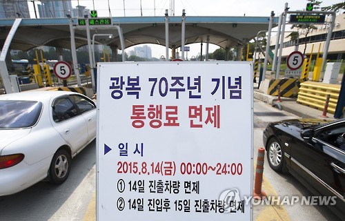| △ 광복 70주년 기념 통행료 면제 (성남=연합뉴스) 윤동진 기자 = 사상 처음으로 고속도로 통행료가 전액 면제되는 14일 오전 성남시 분당구 궁내동 서울 톨게이트에 통행료를 면제한다는 알림판이 세워져 있다. |