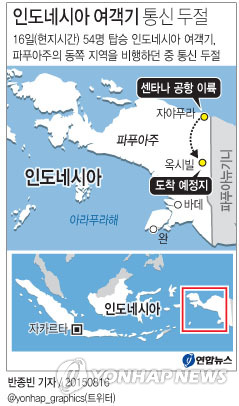 (자카르타 서울=연합뉴스) 신성철 통신원 장재은 기자 = 인도네시아 여객기가 16일(현지시간) 54명을 태우고 악천후 속에 파푸아주의 동쪽 지역을 비행하던 중 통신이 두절됐다.