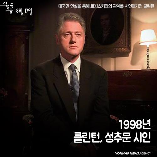 (서울=연합뉴스) 1998년 8월17일(현지시간) 빌 클린턴 미국 대통령이 TV 카메라 앞에 섰다. 클린턴은 대국민 연설을 통해 백악관 인턴 직원이었던 모니카 르윈스키(Monica Lewinsky)와 '부적절한 관계'를 가졌다고 시인했다. 클린턴의 연설은 TV를 통해 미국 전역에 생중계됐고 미국인들은 대통령의 '불륜 고백'에 경악했다.