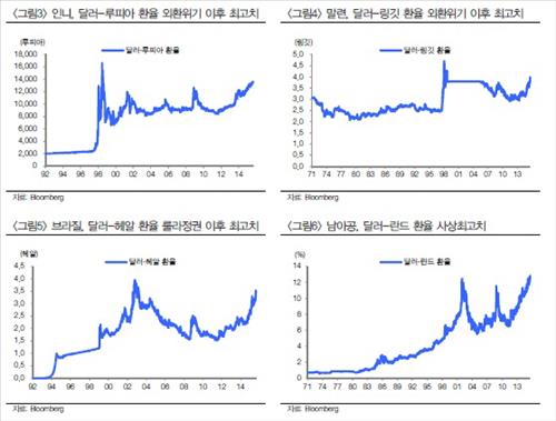 미국 달러화에 대한 브라질의 헤알화나 칠레의 페소화 환율은 각각 2002년 10월 이후 최고 수준으로 역시 금융위기 때보다도 통화가치가 낮은 상태다. 브라질 헤알화는 올해 들어서만 30%가량 평가절하됐다.