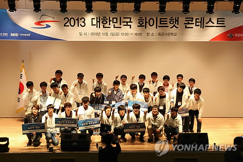 | △ 국방부와 국가정보원의 공동 주최로 열린 최고의 보안전문가(화이트 해커)를 선발하는 '화이트햇 콘테스트' 본선대회에서 참가자들이 기념촬영을 하고 있다.(연합뉴스 자료사진) |