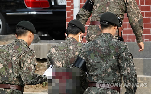 | △ 작년 6월 강원도 고성군 육군 22사단 일반전초(GOP)에서 수류탄 투척과 총기난사로 동료 5명을 살해한 임모(23) 병장이 지난해 11월 군용버스에서 내려 법정으로 향하고 있다. (연합뉴스 자료사진) |