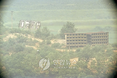 | △ 서부전선 도라OP에서 바라본 북측지역 확성기 (연합뉴스 자료사진) |