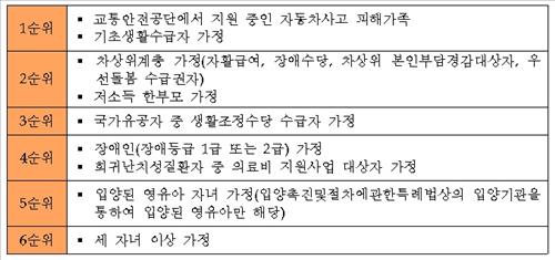 1순위는 자동차사고 피해가족·기초생활수급 가정, 2순위는 차상위계층·저소득 한부모 가정, 3순위는 국가유공자 가운데 생활조정수당 수급자 가정, 4순위는 장애인·희귀난치성질환 의료비 지원대상 가정, 5순위는 입양아 가정, 6순위는 세 자녀 이상 가정이다.
