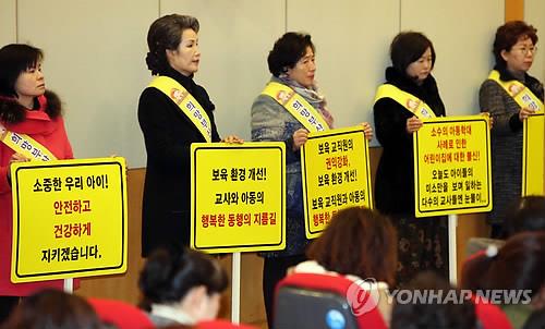 | △ (부산=연합뉴스) 조정호 기자 = 28일 부산시청 대강당에서 어린이집연합회가 보육 교직원 700여 명을 대상으로 마련한 아동학대 예방교육 행사장에서 연합회 관계자들이 아이들을 지키겠다는 내용의 피켓을 들고 있다. 2015.1.28 |