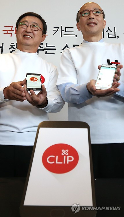 | △ 알아서 챙겨주는 스마트 지갑 '클립' 출시 (서울=연합뉴스) 이지은 기자 = 남규택 KT 마케팅 부문장 부사장(오른쪽)과 서준희 BC카드 사장이 18일 오전 서울 광화문 올레스퀘어에서 KT와 BC카드의 IT·금융 융합 신규 서비스인 '클립'의 출시를 알리며 포즈를 취하고 있다. 2015.8.18 jieunlee@yna.co.kr |