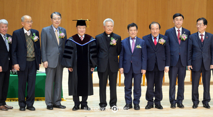 | △윤장현 광주광역시장이 1일 오후 북구 용봉동 전남대학교 민주마루에서 열린 정병석 제20대 전남대 총장 위임식에 참석해 내빈들과 기념촬영을 하고 있다 |