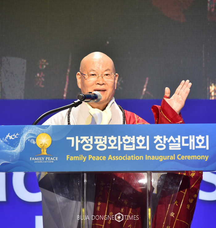 사진은 편백운 대한불교 태고종 총무원장이 “세계평화와 인류행복은 외부로부터 주어지는 것이 아니라 우리가 만드는 것. 위기 시대에 가정평화협회 창설은 시의적절”이라며 축사하고 있다. 2017.12.04. (사진=가정평화협회 제공)