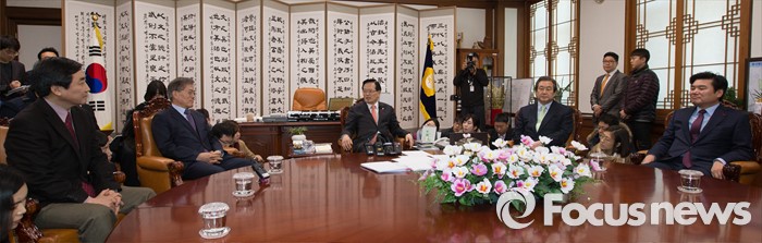 또한 원 원내대표는 "본회의는 28일 오후 2시에 열고 현재 법사위의 법안심의를 마친 무쟁점 법안을 처리할 예정"이라고 밝혔다.27일 오후 서울 국회에서 열린 '내년 4·13 총선에 적용될 선거구 획정과 쟁점 법안에 대한 합의를 도출하기 위한 2+2 회동'에서 정의화(가운데) 국회 의장이 모두발언을 하고 있다. 2015.12.27 조종원 기자