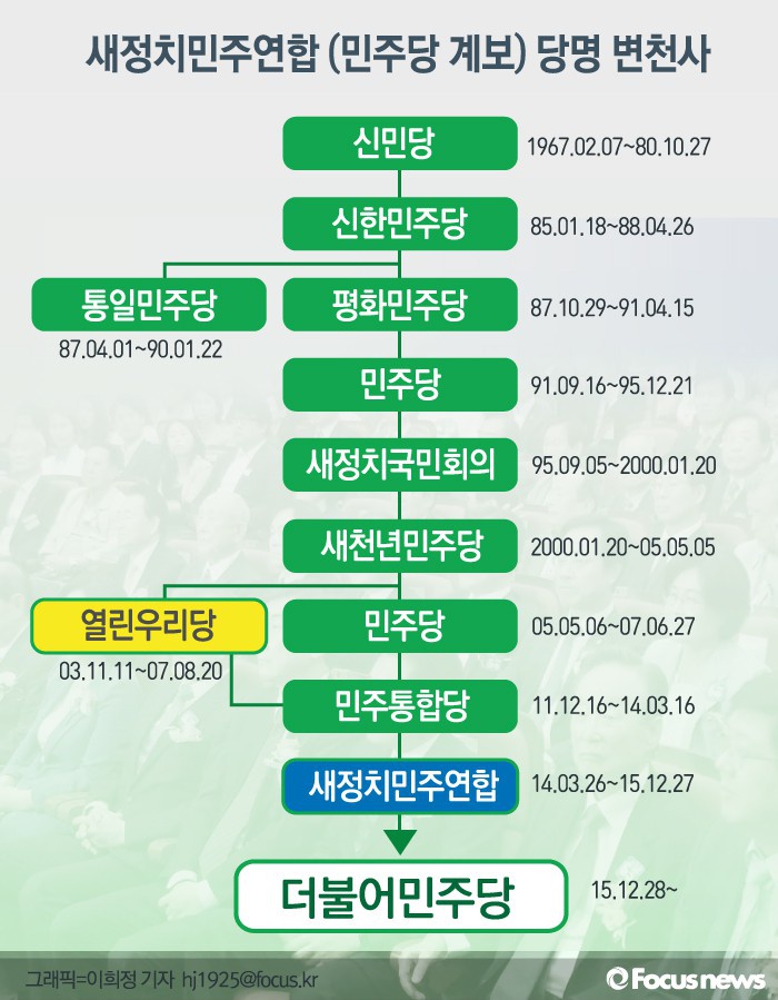 1960년대 신민당에서 시작한 야당 당명(열린우리당 시절 여당 제외)의 변천사는 '민주'와 궤를 같이 한다. 아래 그래픽을 통해 그 역사를 일목요연하게 정리했다.(서울=포커스뉴스) 새정치민주연합의 새로운 당명이 '더불어민주당'으로 확정됐다. 2015.12.28 이희정 기자