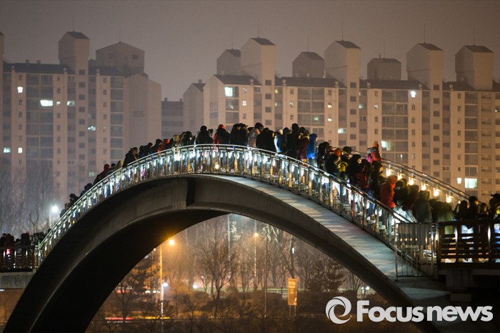 (서울=포커스뉴스) 2016 병신년(丙申年) 첫날인 1일 아침 서울 영등포구 선유도에 새해 첫 일출을 보기 위해 모여든 사람들이 구름다리를 가득 메우고 있다.