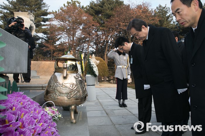 (서울=포커스뉴스) 병신년(丙申年) 새해 첫 날인 1일 오전 동작구 국립서울현충원에서 김무성 새누리당 대표 등 지도부가 이승만 전 대통령 묘역 참배를 하고 있다.