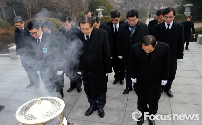 (서울=포커스뉴스) 병신년(丙申年) 새해 첫 날인 1일 오전 동작구 국립서울현충원에서 김무성 새누리당 대표가 박정희 전 대통령 묘역 참배를 하고 있다.
