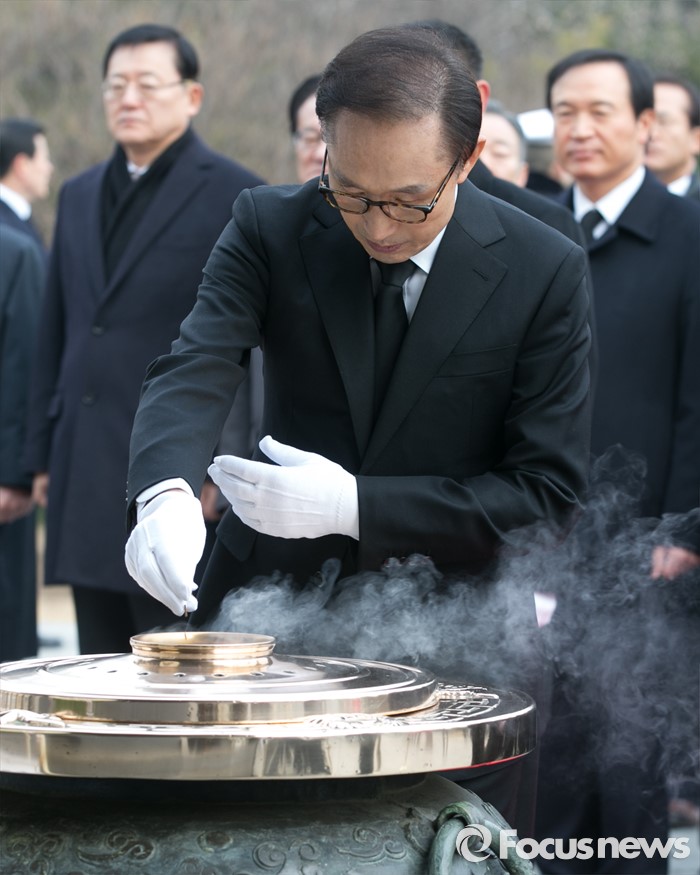 (서울=포커스뉴스) 병신년(丙申年) 새해 첫 날인 1일 오전 동작구 국립서울현충원에서 이명박 전 대통령이 현충탑 참배를 하고 있다.