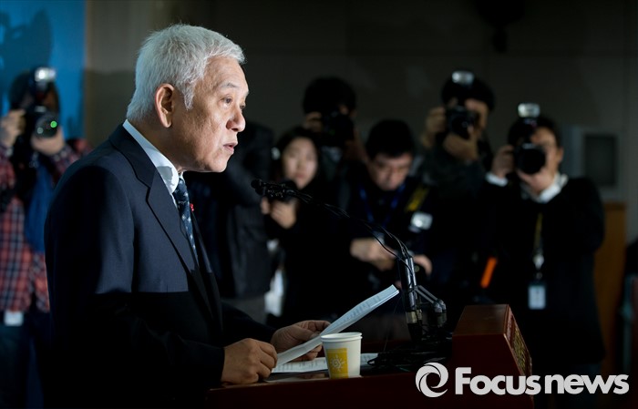 (서울=포커스뉴스) 김한길 더불어민주당 전 공동대표가 3일 오전 서울 여의도 국회 정론관에서 탈당 선언 기자회견을 하고 있다.
