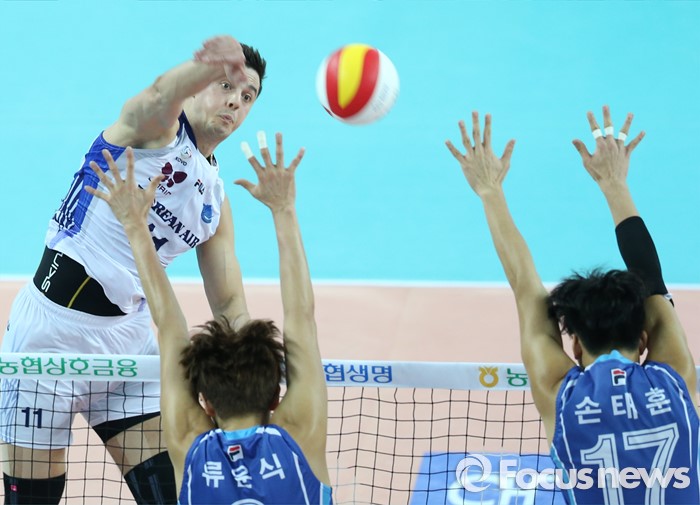 (인천=포커스뉴스) 3일 인천 계양체육관에서 열린 '2015-2016NH농협 V-리그' 남자부 대한항공-삼성화재 경기에서 대한항공 모로즈가 삼성화재 류윤식, 손태훈의 블로킹에 강스파이크를 날리고 있다.