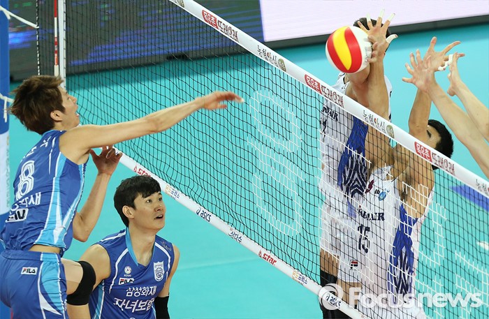 (인천=포커스뉴스) 3일 인천 계양체육관에서 열린 '2015-2016NH농협 V-리그' 남자부 대한항공-삼성화재 경기에서 삼성화재 류윤식의 공격을 대한항공 모로즈와 김형우가 블로킹으로 차단하고 있다.