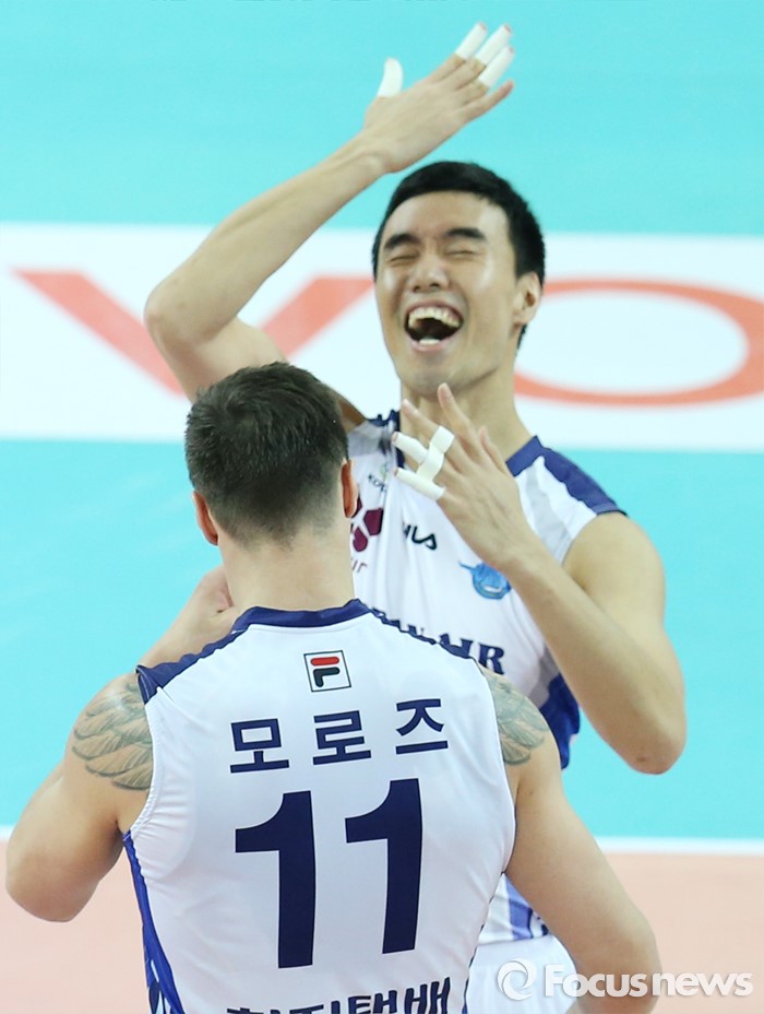 (인천=포커스뉴스) 3일 인천 계양체육관에서 열린 '2015-2016NH농협 V-리그' 남자부 대한항공-삼성화재 경기에서 이마로 블로킹을 성공시킨 대한항공 김형우가 모로즈와 함께 기뻐하고 있다.