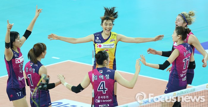 (인천=포커스뉴스) 3일 인천 계양체육관에서 열린 '2015-2016NH농협 V-리그' 여자부 흥국생명-KGC인삼공사 경기에서 득점에 성공한 흥국생명 선수들이 환호하고 있다.