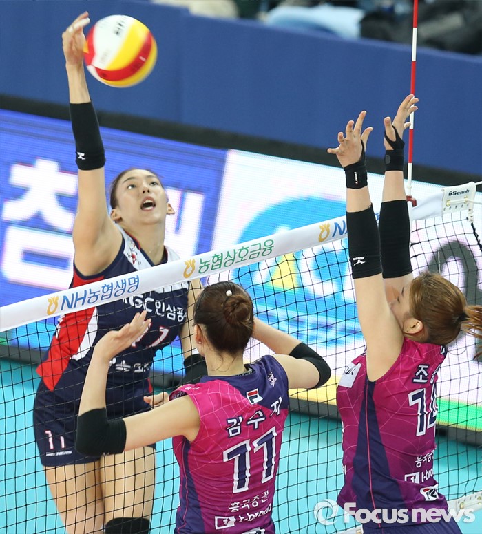 (인천=포커스뉴스) 3일 인천 계양체육관에서 열린 '2015-2016NH농협 V-리그' 여자부 흥국생명-KGC인삼공사 경기에서 KGC인삼공사 문명화가 흥국생명 김수지와 조송화를 앞에 두고 스파이크를 날리고 있다.