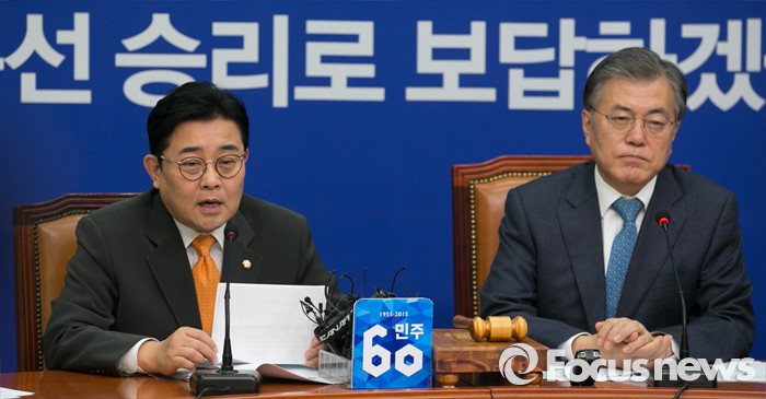 (서울=포커스뉴스) 문재인(오른쪽) 더불어민주당 대표가 4일 오전 서울 여의도 국회에서 열린 최고위원회의에 참석해 전병헌 최고위원의 발언을 듣고 있다.