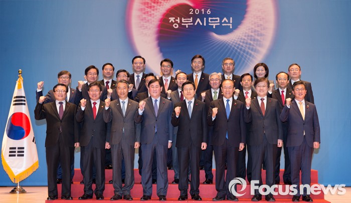 (세종=포커스뉴스) 황교안 국무총리와 각 부처 장관들이 4일 오전 세종시 정부세종청사 대강당에서 열린 2016년 정부시무식에 참석해 기념촬영을 하고 있다.