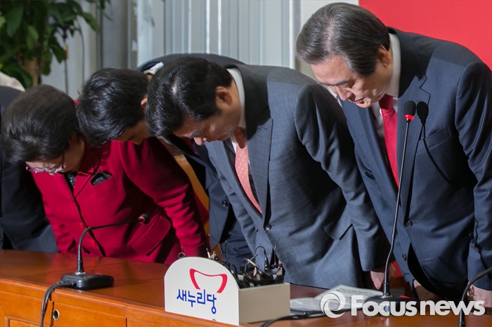(서울=포커스뉴스) 새누리당 김무성(오른쪽) 대표와 원유철(오른쪽 두번째) 원내대표를 비롯한 최고위원들이 4일 오전 서울 여의도 국회에서 열린 새누리당 최고위원회의에 참석해 인사하고 있다.