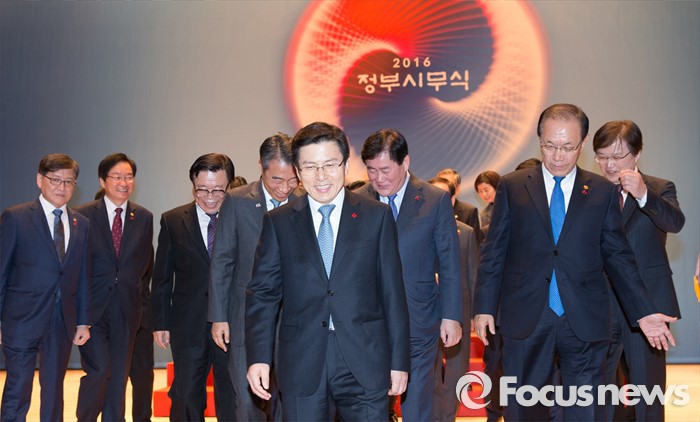 (세종=포커스뉴스) 황교안 국무총리와 각 부처 장관들이 4일 오전 세종시 정부세종청사 대강당에서 열린 2016년 정부시무식에서 기념촬영을 마치고 단상을 내려오고 있다.