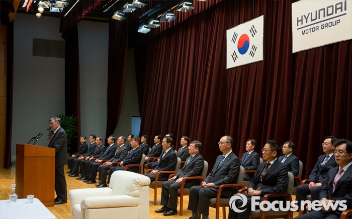 (서울=포커스뉴스) 4일 오전 서울 서초구 현대자동차 본사 대강당에서 열린 2016년도 시무식에 참석한 정몽구 현대차그룹 회장이 신년사를 하고 있다.