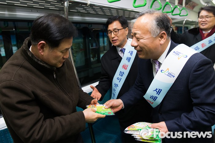 (서울=포커스뉴스) 이정원(오른쪽) 서울메트로 사장이 4일 오전 2호선 열차 안에서 시민들에게 핫팩을 나눠주며 새해 인사를 하고 있다.